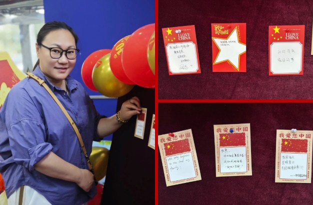 楼下大厅的活动满是巧思。职工先在卡片上写下对祖国的祝福,“愿祖国繁荣昌盛”“祝祖国生日快乐”……一句句真挚话语被郑重贴在“家国祝福板”上,映着大家的爱国情。紧接着的风铃手作环节里,有人串起葫芦状的木片与铜铃,摇起来似带着“福禄”的祝愿;有人偏爱燕子造型,让灵动的轮廓伴着铃声像要振翅。多样的风铃造型格外吸睛,不少路过的人都忍不住停下脚步,好奇地围过来瞧瞧。
