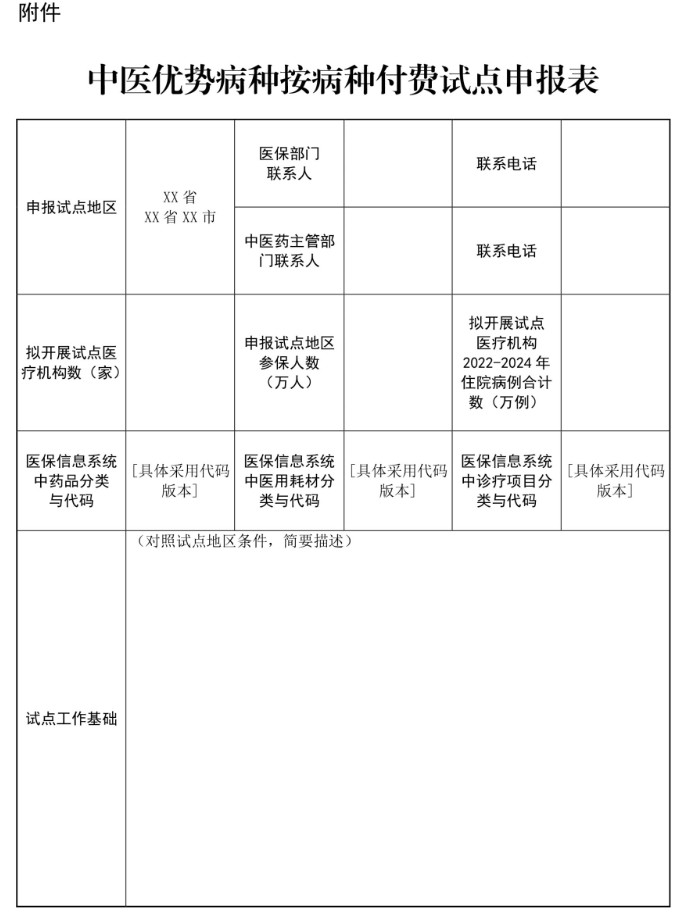 试点地区应符合以下条件:当地政府高度重视医保和中医药发展工作,已实现按病种(病组)20版实际付费,且有较强的参与中医优势病种按病种付费方式改革意愿或已开展中医优势病种支付方式改革工作;医保和中医药部门配合密切,有能力承担国家试点任务,牵头制定本地试点方案,并统筹推进试点;依托全国统一的医保信息平台,使用中医疾病分类与代码、中医证候分类与代码。